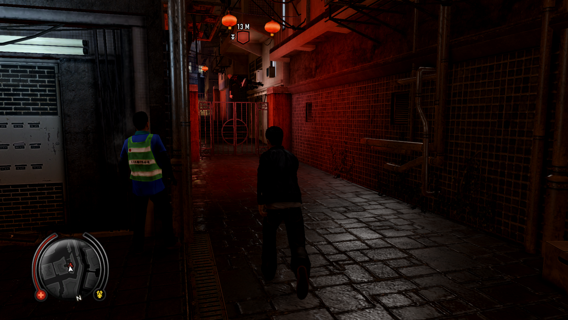 Ming will run into another back alley, jumping fences before closing one off. After throwing it open, he will run inside of a thug hideout. Five thugs guard its entrance. You will need to dispatch them before you can continue to chase Ming. There are plenty of environmental grapple locations, including a shutter, boxes, and an air conditioning unit. Once, the last thug is left, grapple him into the nearby dumpster. Ming is on the walkway above it, so use the dumpster to boost yourself up to him.